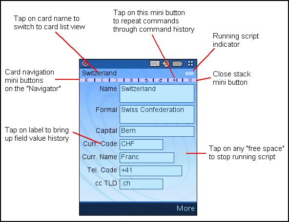 Top left the name of the current is displayed. Top right is the script execution progress indicator. Below the card name is the Navigator, something like a very small button bar, taking up less precious screen real estate than a standard UIQ button bar and double-serving as a boundary between card name and the fields. For details about the "mini buttons" see below.