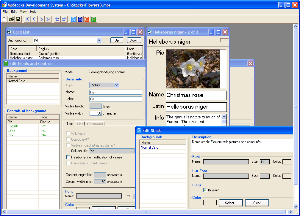 The following screenshot gives an impression what the MoStacks Windows application for stack development looks like - click for full-size picture: