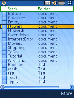 Tapping anywhere on a line except the little box at the far left opens a stack and shows the first card in the Card View. The little boxes allow to select one stack or several of them for the operations in the Stack menu, e.g. for deleting them.